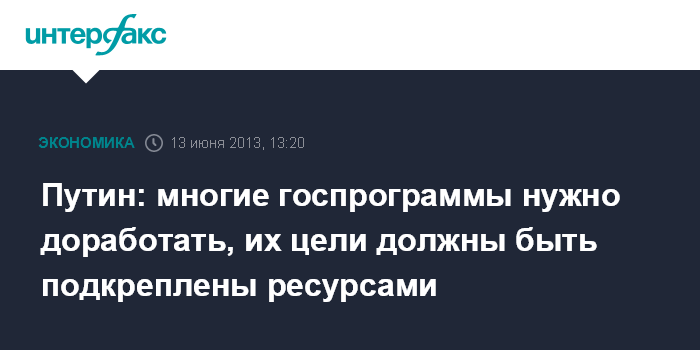 Москва. 13 июня. INTERFAX.RU - Цели, заявленные во многих государственных программах, не подкреплены бюджетными ресурсами, программы нуждаются в доработке, считает президент РФ Владимир Путин.