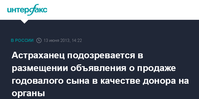 Астрахань. 13 июня. INTERFAX.RU - Полиция задержала жителя Астрахани, подозреваемого в размещении в Интернете объявления о продаже ребенка за 800 тыс. рублей.