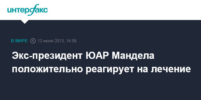 Йоханнесбург. 13 июня. INTERFAX.RU - Бывший президент ЮАР Нельсон Мандела положительно реагирует на лечение в больнице в Претории, говорится в обнародованном в четверг коммюнике южноафриканского правительства.