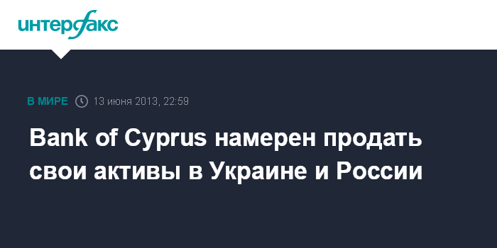 Киев. 13 июня. INTERFAX.RU - Bank of Cyprus намерен продать российский Юниаструм Банк и отказаться от работы в Украине, так как в нынешней ситуации сохранение этих активов является роскошью, сообщил кипрский ресурс offsite по итогам встречи руководства банка во главе с временным управляющим Христоса Соротоса с журналистами.