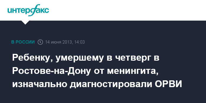 Ростов-на-Дону. 14 июня. INTERFAX.RU - Двухлетнему мальчику, скончавшемуся 13 июня в Ростове-на-Дону от менингококковой инфекции, сначала было диагностировано ОРВИ, сообщил начальник Управления здравоохранения Ростова-на-Дону Рафаил Девликамов.
