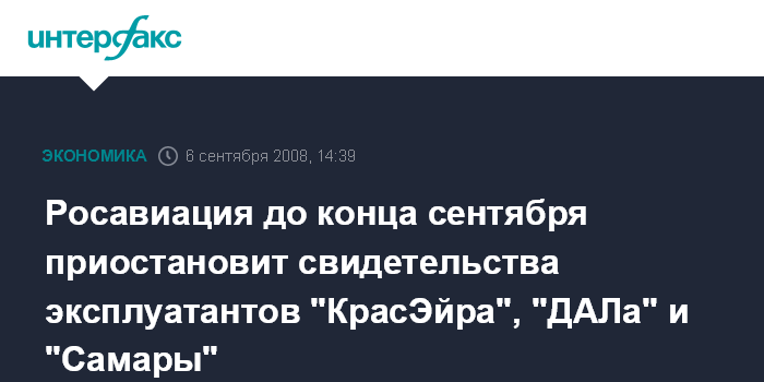 "ДАЛ", "Самара" и "КрасЭйр" до 30 сентября будут летать под собственными позывными. 30 сентября решением Росавиации свидетельства эксплуатантов у этих компаний будут приостановлены", - сказал он.