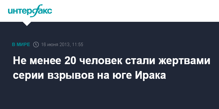 Багдад. 16 июня. INTERFAX.RU - По меньшей мере, 20 человек погибли и еще 56 получили ранения в результате взрывов нескольких начиненных взрывчаткой автомобилей на юге и юго-востоке Ирака, сообщили в воскресенье местные власти.