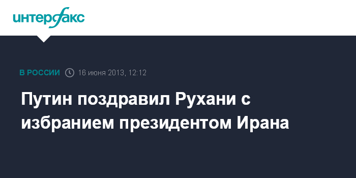 Москва. 16 июня. INTERFAX.RU - Президент РФ Владимир Путин поздравил Хасана Рухани с избранием президентом Ирана, сообщает в воскресенье пресс-служба Кремля. "В поздравительной телеграмме В.Путин выразил уверенность в том, что деятельность Рухани на этом высоком посту будет способствовать процветанию дружественного Ирана и дальнейшему укреплению российско-иранских отношений", - говорится в сообщении.