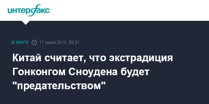 Китай считает, что экстрадиция Гонконгом Сноудена будет "предательством"
