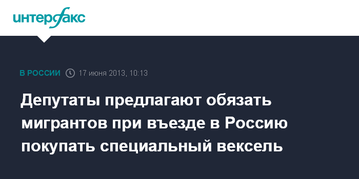 Москва. 17 июня. INTERFAX.RU - Депутаты Госдумы Алексей Журавлев и Сергей Жигарев разработали поправки к федеральным законам "О порядке выезда из РФ и въезда в РФ" и "О правовом положении иностранных граждан в РФ", обязывающие иностранцев при въезде в Россию, не требующем получения визы, приобретать миграционный вексель, пишет газета "Коммерсант" в понедельник.