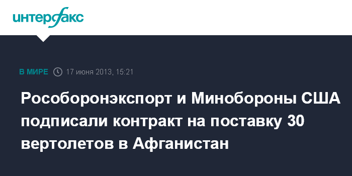 Рособоронэкспорт и Минобороны США подписали контракт на поставку 30 вертолетов в Афганистан