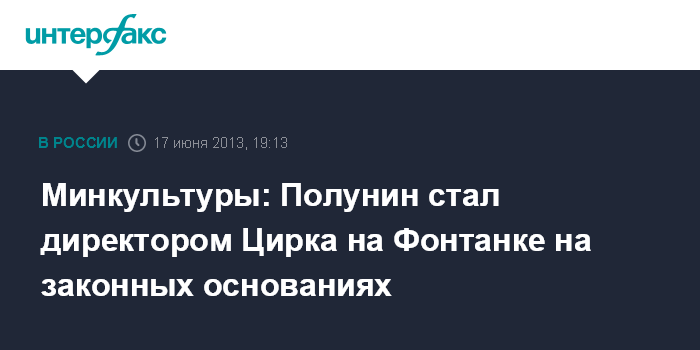 Москва. 17 июня. INTERFAX.RU - Назначение Вячеслава Полунина директором Санкт-Петербургского государственного цирка (Цирка на Фонтанке - ИФ) без проведения конкурса было легитимным, заявил директор департамента государственной поддержки профессионального искусства и народного творчества министерства культуры РФ Софья Апфельбаум.