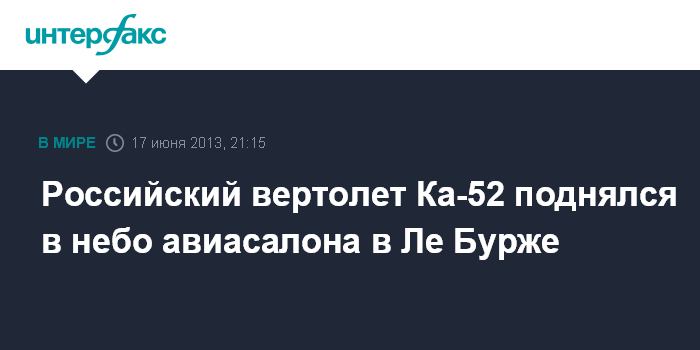 Ле Бурже (Франция). 17 июня. INTERFAX.RU- Российский боевой вертолет Ка-52 "Аллигатор" приступил к программе показательных полетов на авиасалоне в Ле Бурже во Франции.