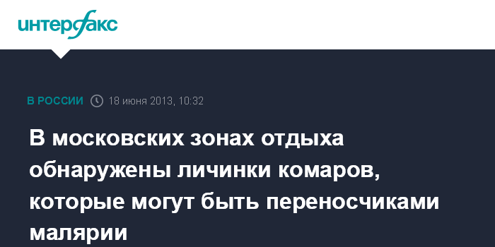 Москва. 18 июня. INTERFAX.RU - Личинки комаров рода Анофелес, которые могут оказаться переносчиками плазмодиев малярии, обнаружены специалистами столичного управления Роспотребнадзора в трех зонах отдыха без купания, сообщает официальный портал ведомства.