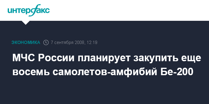 "МЧС обратилось к руководству страны о закупке дополнительной партии из восьми самолетов-амфибий Бе-200", - сообщил журналистам на "Гидроавиасалоне-2008" в Геленджике генеральный директор, генеральный конструктор Таганрогского авиационного научно-технического комплекса им.Бериева Виктор Кобзев.