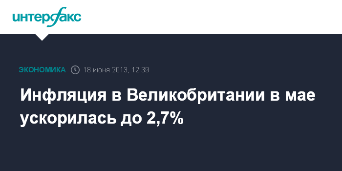 18 июня. FINMARKET.RU - Инфляция в Великобритании в мае 2013 года в годовом выражении ускорилась до 2,7% после 2,4% в апреле, свидетельствуют данные Национального статистического управления страны.