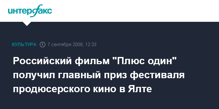 Москва. 7 сентября. INTERFAX.RU - Российская кинокартина "Плюс один" режиссера Оксаны Бычковой удостоена главного приза за лучший фильм - "Большого Золотого яблока" - на 8-м Международном фестивале продюсерского кино России и Украины "Кино-Ялта". Об этом сообщает пресс-центр фестиваля.