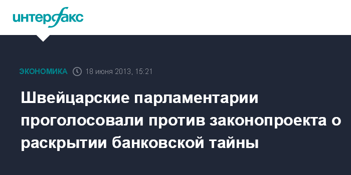 Цюрих. 18 июня. INTERFAX.RU - Нижняя палата парламента Швейцарии во вторник в первом чтении проголосовала против законопроекта, который обязывает банки предоставлять информацию другим странам относительно своих зарубежных клиентов, сообщает агентство Bloomberg.