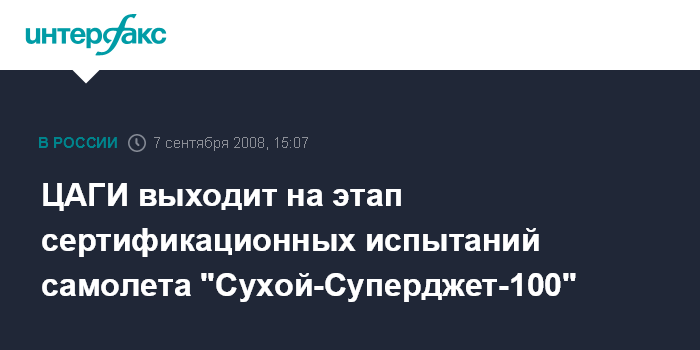 "Сейчас мы выходим на этап начала сертификационных испытаний. В ближайшее время компания "Гражданские самолеты Сухого" должна представить нам самолет для этих испытаний. Прибытия самолета из Комсомольска в Жуковский мы ожидаем буквально со дня на день", - сказал директор ЦАГИ Сергей Чернышев журналистам на завершающемся в воскресенье в Геленджике гидроавиасалоне-2008.