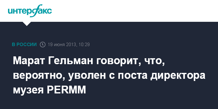 Москва. 19 июня. INTERFAX.RU - Галерист Марат Гельман, вероятно, лишился поста директора музея современного искусства PERMM, об этом он сообщил в своем микроблоге в "Твиттере".