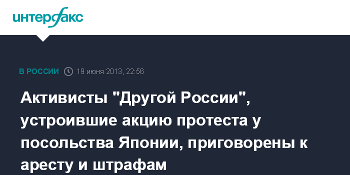 Москва. 19 июня. INTERFAX.RU - Суд в Москве приговорил к аресту и штрафам активистов незарегистрированной партии "Другая Россия", которые в среду устроили акцию протеста у посольства Японии.