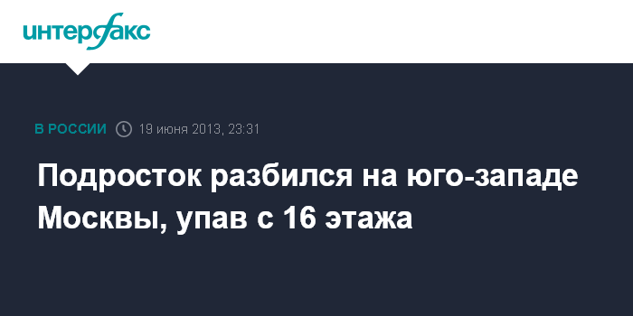 Москва. 19 июня.INTERFAX.RU - Подросток погиб в результате падения с 16-ого этажа на западе Москвы, сообщили журналистам в пресс-службе столичного главка МВД.