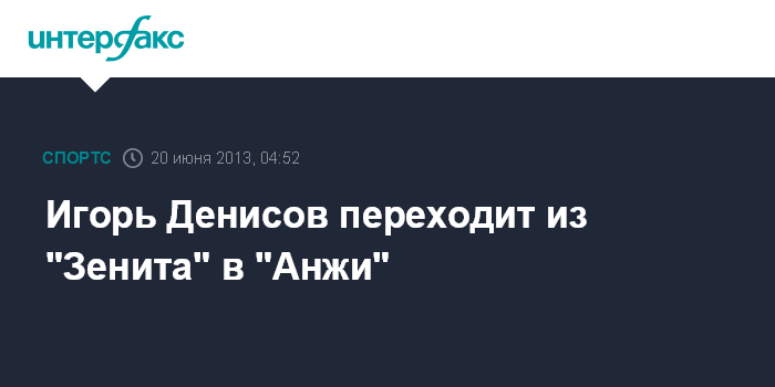 Москва. 20 июня. СПОРТ-ЭКСПРЕСС/ИНТЕРФАКС - Полузащитник сборной России и петербургского футбольного клуба "Зенит" Игорь Денисов продолжит карьеру в махачкалинском "Анжи".