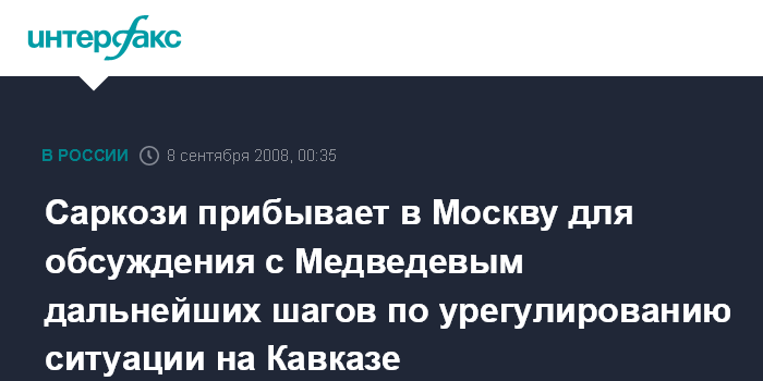 Москва. 8 сентября. ИНТЕРФАКС - Президент Франции Николя Саркози прибывает в понедельник в Москву для переговоров с российским коллегой Дмитрием Медведевым по ситуации вокруг Южной Осетии и Абхазии.