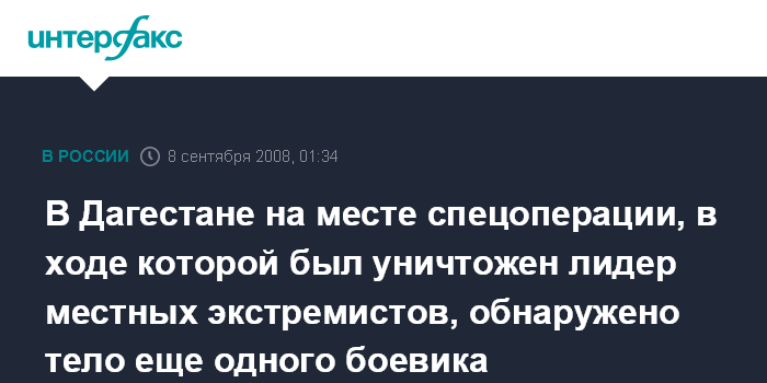 Махачкала. 8 сентября. ИНТЕРФАКС - На месте спецоперации в Магарамкентском районе Дагестана, где в воскресенье был уничтожен так называемый амир республики Ильгар Малачиев, обнаружено тело еще одного боевика.