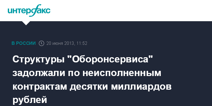 Москва. 20 июня. INTERFAX.RU - Главная военная прокуратура выявила задолженность по неисполненным контрактам на десятки миллиардов рублей в структурах, входящих в ОАО "Оборонсервис".