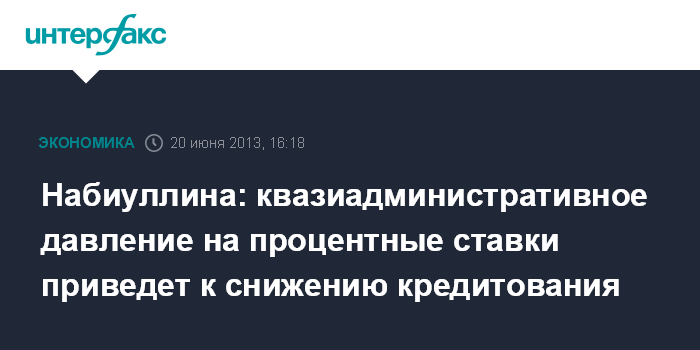 Москва. 20 июня. INTERFAX.RU - Влияние на банковские процентные ставки административными или квазиадминистративными методами приведет к снижению объемов кредитования, считает помощник президента РФ, будущая глава ЦБ РФ Эльвира Набиуллина.