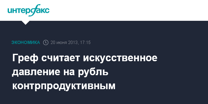 Санкт-Петербург. 20 июня. INTERFAX.RU - Президент - председатель правления Сбербанка России Герман Греф считает, что любое искусственное давление на рубль является контрпродуктивным.