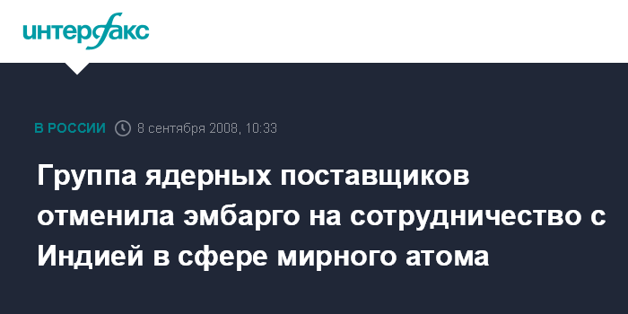 Вена. 8 сентября. INTERFAX.RU - Группа ядерных поставщиков (ГЯП), объединяющая 44 государства, по итогам совещания в минувшую субботу в Вене единогласно утвердила решение об отмене запрета на международное сотрудничество с Индией в сфере мирного атома, введенное после проведенных этой страной испытаний ядерного оружия.