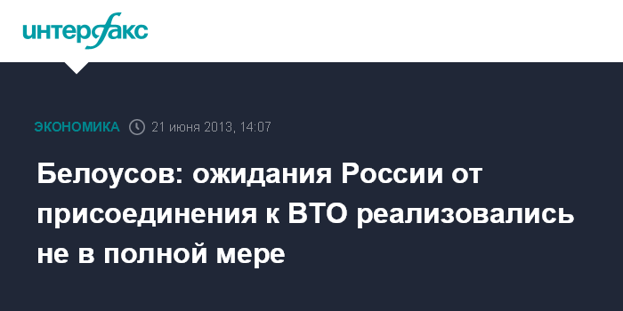"Я не могу сказать, что Доха-раунд провалился, я так смогу сказать после встречи в Бали (намечена на конец 2013 года - ИФ), если она будет неудачной. Более того, мы являемся последовательными сторонниками того, чтобы Доха-раунд был успешным, но факт (проблем в этом раунде - ИФ) остается фактом. И возможности, на которые мы рассчитывали, не реализованы, и это несколько девальвирует эффект (от присоединения к ВТО - ИФ)", - заявил Белоусов.