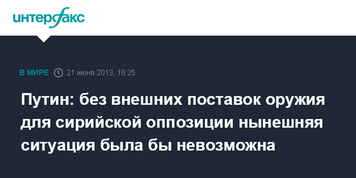 "Что касается противоборствующей стороны (оппозиция - ИФ), то обращаю ваше внимание на то, что она давно уже получает оружие из-за границы. И мы сейчас не будем говорить о происхождении этих видов вооружений, но ясно, что без поставок из-за рубежа то, что происходит сейчас, в Сирии было бы просто невозможно", - заявил Путин на пленарном заседании Петербургского международного экономического форума.