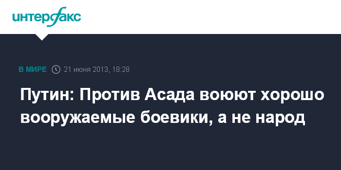 Санкт-Петербург. 21 июня. INTERFAX.RU - Президент России Владимир Путин подчеркивает, что в Сирии против режима Асада воюет не народ страны, а боевики.