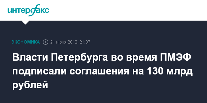 Санкт-Петербург. 21 июня INTERFAX.RU - Общий объем инвестиций в экономику Петербурга по соглашениям и проектам, представленным на Петербургском международном экономическом форуме-2013, составит около 130 млрд рублей, сообщил губернатор северной столицы Георгий Полтавченко журналистам в пятницу вечером.