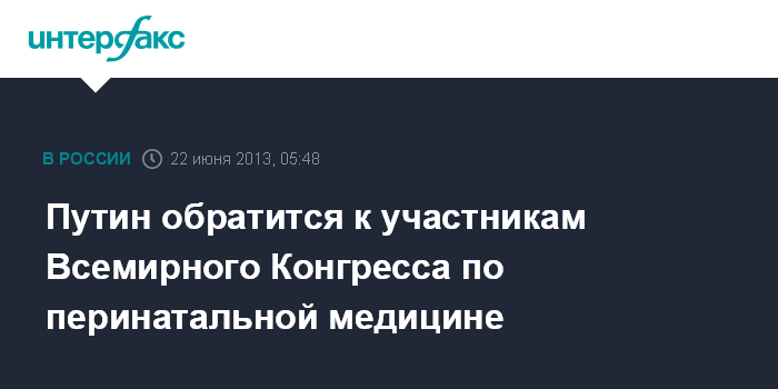 Москва. 22 июня. ИНТЕРФАКС - Президент России Владимир Путин в субботу выступит перед участниками XI Всемирного Конгресса по перинатальной медицине, впервые проводящегося в России, сообщила пресс-служба главы государства.