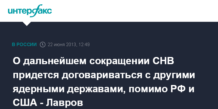 Москва. 22 июня. INTERFAX.RU - После выполнения договора по СНВ дальнейшее сокращение стратегических наступательных вооружений придется обсуждать в многостороннем формате, поскольку речь пойдет об уровне, сопоставимом с другими странами, помимо России и США, заявил глава МИД РФ Сергей Лавров.