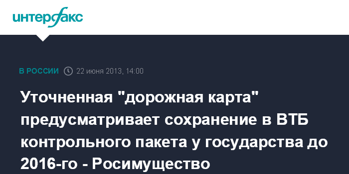 Уточненная "дорожная карта" предусматривает сохранение в ВТБ контрольного пакета у государства до 2016-го - Росимущество