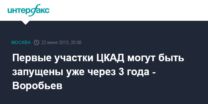 "Первоначально запуск планировался в 2020 году, потом сроки были смещены на 2018. Инициатива президента позволяет рассчитывать на запуск первых очередей ЦКАДа во второй половине 2016 - начале 2017 года. Нам очень приятно, что президент поддержал Подмосковье, это наша победа, потому что дорога - это жизнь", - заявил А.Воробьев в эфире радиостанции "Вести ФМ".