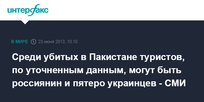 Лондон. 23 июня. INTERFAX.RU - В результате атаки боевиков на гостиницу на севере пакистанского Кашмира погибли, по предварительным уточненным данным, один гражданин России, пять - Украины и трое - КНР, сообщает британская телерадиокорпорация BBC. В результате нападения погибла также гражданка Пакистана.