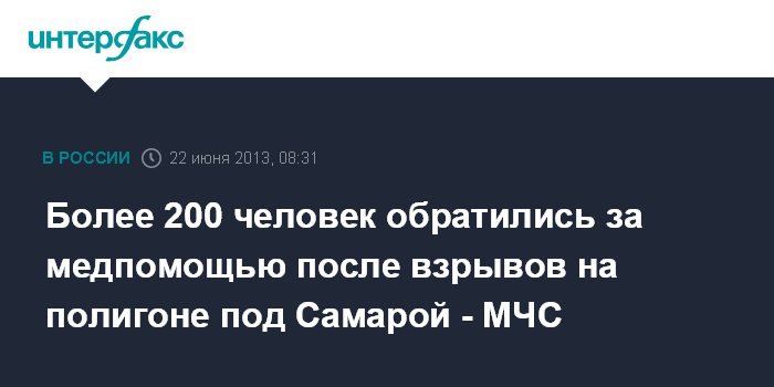 Москва. 22 июня. ИНТЕРФАКС - Медики оказали помощь более чем 200 обратившимся в связи с взрывами снарядов на полигоне в Самарской области, сообщает в субботу МЧС России.