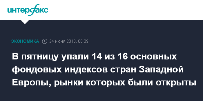 14 из 16 основных фондовых индексов стран Западной Европы, рынки которых были открыты в пятницу, продемонстрировали снижение по итогам торгов. В Финляндии и Швеции биржи не работали в связи с праздниками.