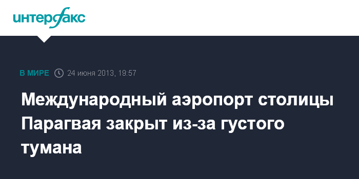 Буэнос-Айрес. 24 июня. INTERFAX.RU - Международный аэропорт Сильвио Петтиросси в Парагвае будет закрыт в течение всего дня по причине густого тумана, сообщили в понедельник в администрации парагвайского аэропорта.