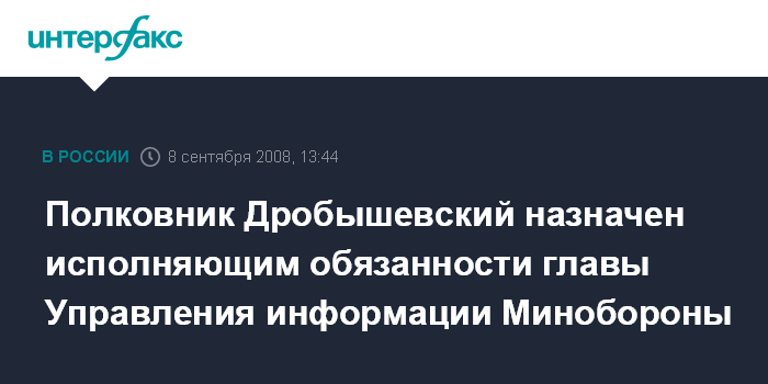 Москва. 8 сентября. INTERFAX.RU - Управление пресс-службы и информации Минобороны РФ возглавил полковник Александр Дробышевский, сообщили "Интерфаксу-АВН" в российском военном ведомстве.