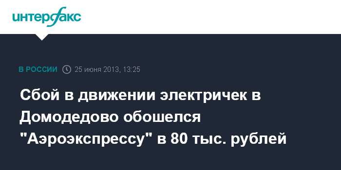 Москва. 25 июня. INTERFAX.RU - Сбой в движении электричек между Москвой и аэропортом "Домодедово" в понедельник обошелся ООО "Аэроэкспресс" в 80 тыс. рублей, сообщил ж/д оператор.