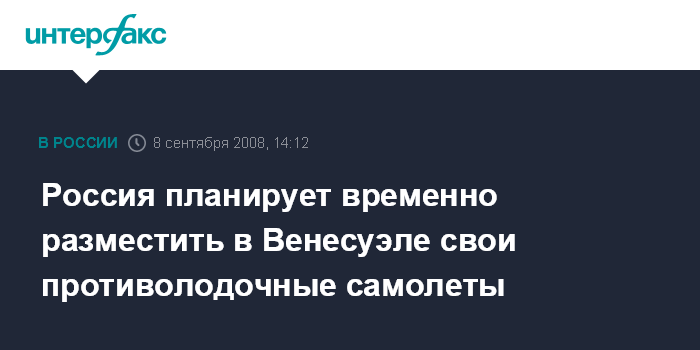 Москва. 8 сентября. INTERFAX.RU - Корабли ВМФ РФ в этом году осуществят заход в один из портов Венесуэлы, а российские противолодочные самолеты будут временно размещены на аэродроме этой страны, сообщил официальный представитель МИД РФ Андрей Нестеренко.