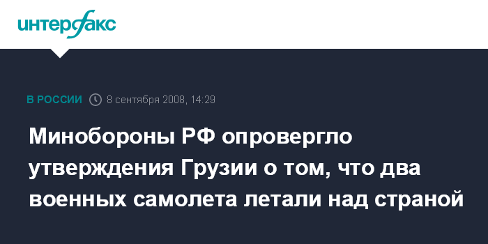 Москва. 8 сентября. INTERFAX.RU - Министерство обороны России опровергло утверждения грузинской стороны о том, что два военных самолета нарушили воздушное пространство Грузии.