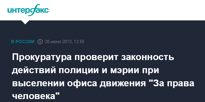 Москва. 26 июня. INTERFAX.RU - Столичная прокуратура организовала проведение собственной проверки, чтобы сделать выводы были ли законны действия полиции и представителей мэрии в ходе выселения правозащитников из офиса движения "За права человека" в центре Москвы.