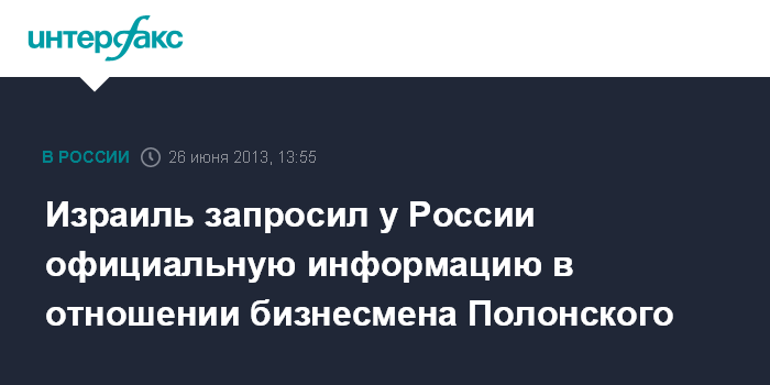 Москва. 26 июня. INTERFAX.RU - Израильские власти запросили у российской стороны официальную информацию в отношении предпринимателя Сергея Полонского, который объявил о намерении получить израильский паспорт.