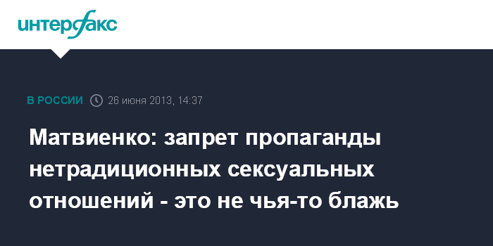 Санкт-Петербург. 26 июня. INTERFAX.RU - Законопроект о запрете пропаганды нетрадиционных сексуальных отношений среди несовершеннолетних не носит дискриминационного характера по отношению к представителям секс-меньшинств, заявила спикер Совета Федерации Валентина Матвиенко.