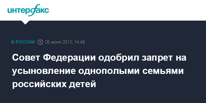 Санкт-Петербург. 26 июня. INTERFAX.RU - Совет Федерации одобрил закон, запрещающий усыновление российских сирот однополыми парами, а также незамужними или неженатыми иностранцами из тех государств, где такие браки разрешены.