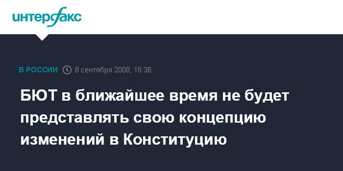 Москва. 8 сентября. INTERFAX.RU - Блок Юлии Тимошенко в ближайшее время не намерен представлять свою концепцию изменений в Конституцию, заявляет лидер блока, премьер-министр Украины Юлия Тимошенко.